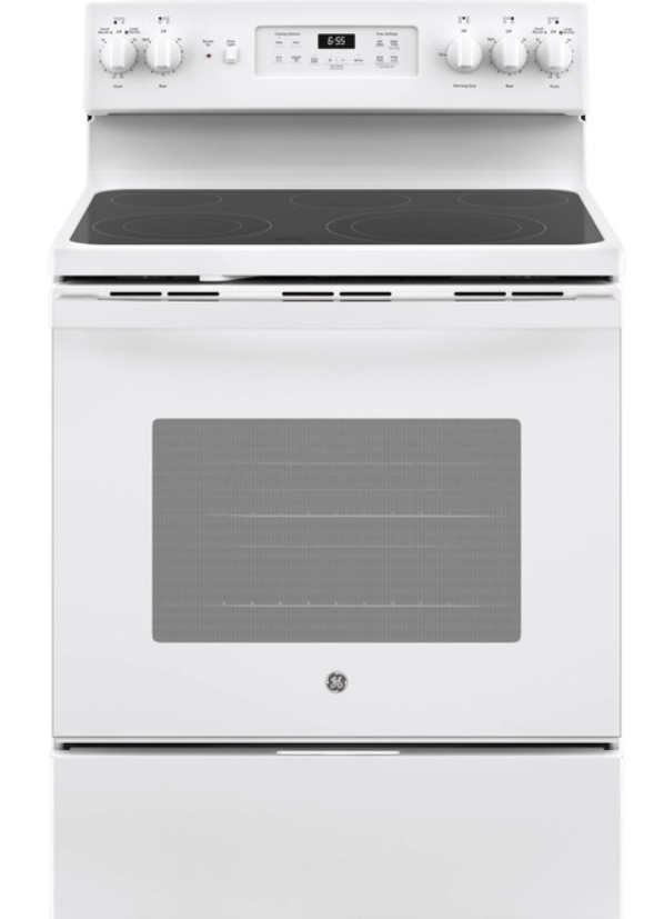 GE® 30" White Free Standing Electric Range with 5.3 cu. ft. total capacity, self clean oven and 5 element warming zoneRead More