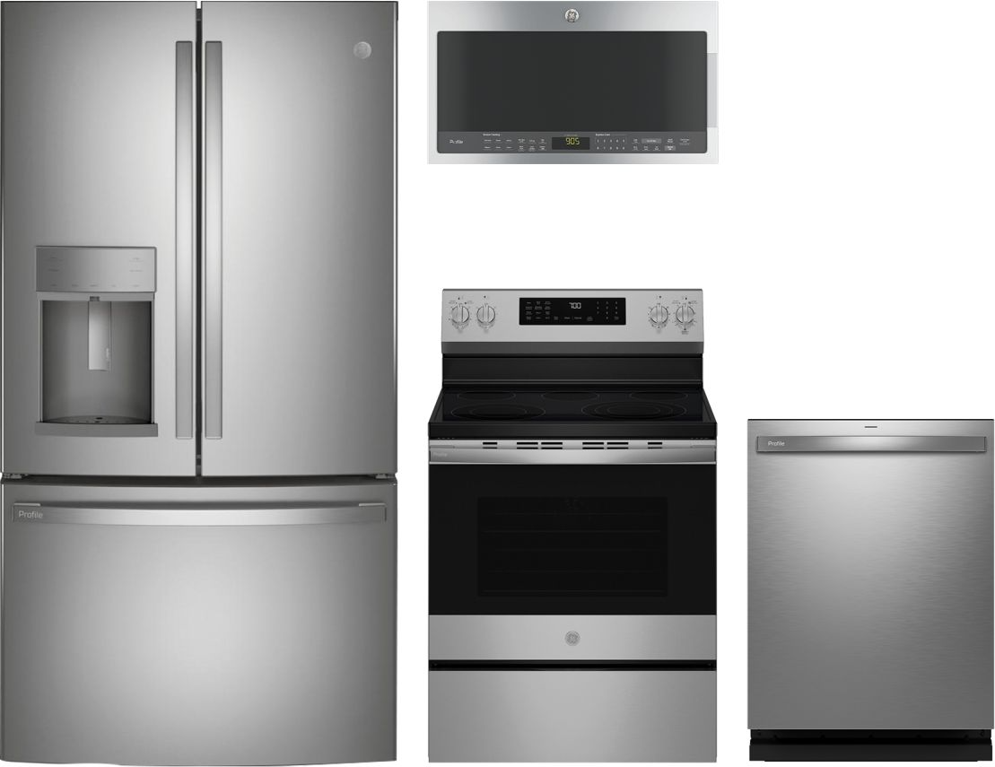 GE Profile™ 4 Piece Stainless Steel Kitchen Package with a French door refrigerator, freestanding electric range, built in dishwasher and over the range microwave.Read More