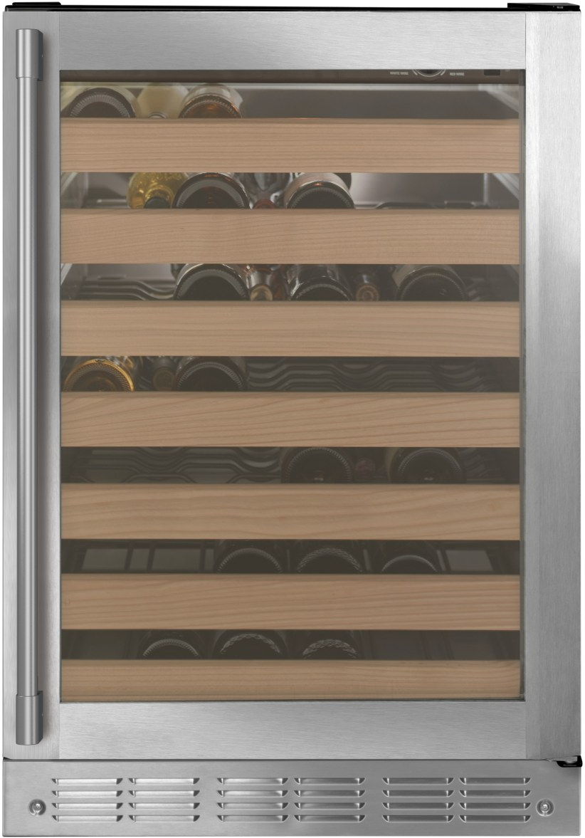 Full-extension sliding wine racks hold up to 57 bottles positioned either horizontally or vertically to maximize space and can be removed for larger bottles. Soft interior LED lighting automatically illuminates when the door is open but can be activated by an internal on/off switch.Read More