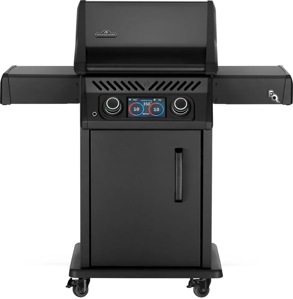 Revolutionize your BBQ experience with the powerful and connected REQ365 Electric Grill. Rivaling the performance of traditional gas grills, the REQ365 offers unmatched versatility for BBQing, baking, roasting, and smoking. Two independently controlled heating elements offer precise temperature control at your fingertips via the 7-inch display, backlit control knobs, and smart devices with Wi-Fi and Bluetooth. Maintenance is simple with self-cleaning mode and accessible drip pan, while the integrated smoker box and temperature probes ensure perfect results. The durable black powder-coated body houses a spacious cabinet, and folding side shelves with integrated tool hooks keep everything within reach. Safety features like a high-temp warning system and locking caster wheels provide peace of mind. Know you are grilling with Napoleon with the iconic porcelainized cast iron WAVE™ cooking grids. Powered by a 220-240V plug with 5 kW output, this grill redefines outdoor cooking with style and innovation.Read More